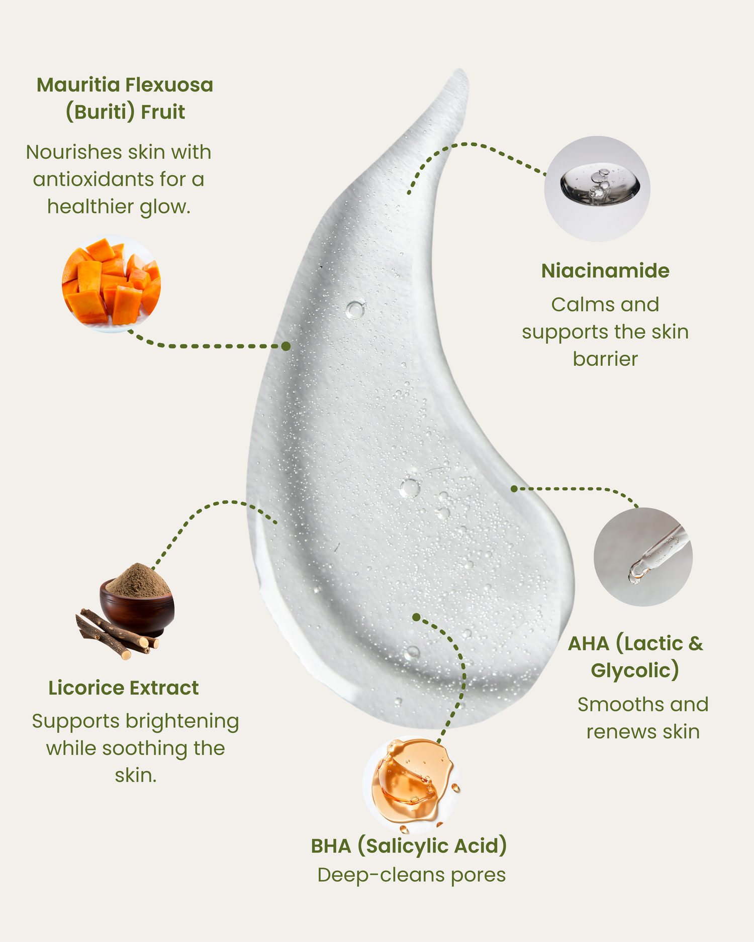 Key Active Ingredients: Niacinamide, Lactic Acid & Glycolic Acid, Salicylic Acid, Licorice Extract, Mauritia Flexuosa and Pulp Powder.